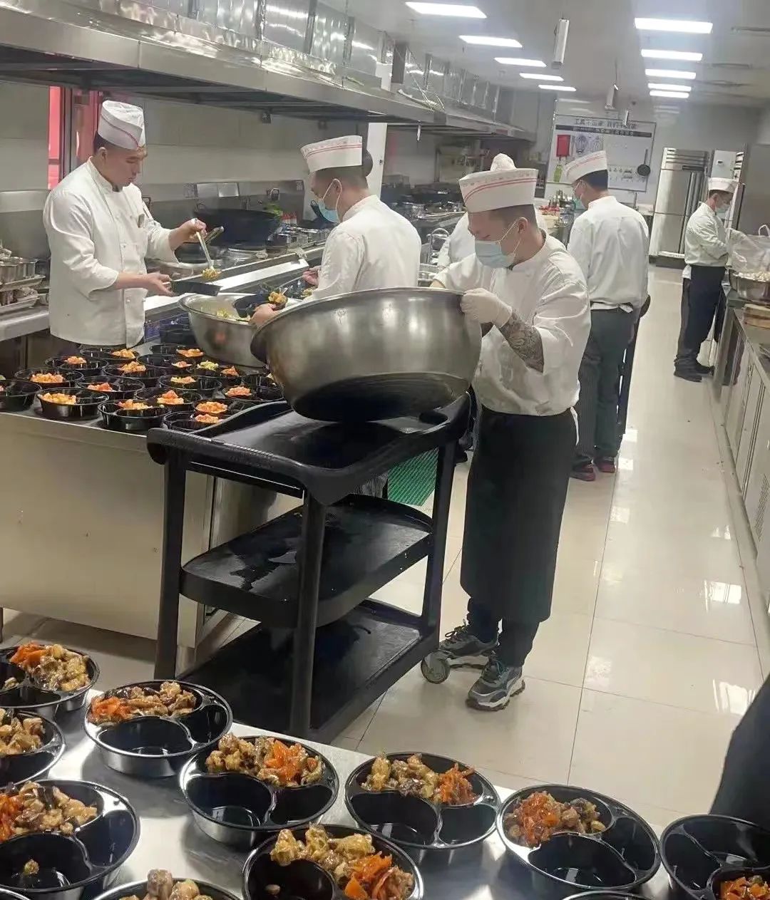 因?yàn)橐咔樾枰?,中天?guó)際酒店每天為一線抗疫工作人員制作800余份盒飯。食堂精心準(zhǔn)備,葷素搭配、營(yíng)養(yǎng)均衡。面對(duì)激增的工作量,酒店公司上下動(dòng)員,各部門(mén)積極配合,每一名員工在酒店備餐區(qū)、客房區(qū)隨時(shí)待命,有序地進(jìn)行配餐分裝、保障工作,他們既是分餐員、又是保潔員、配送員……他們沖鋒在前、不怕苦、不怕累,隨時(shí)做好準(zhǔn)備充實(shí)到酒店緊急、需要人手補(bǔ)充的地方。