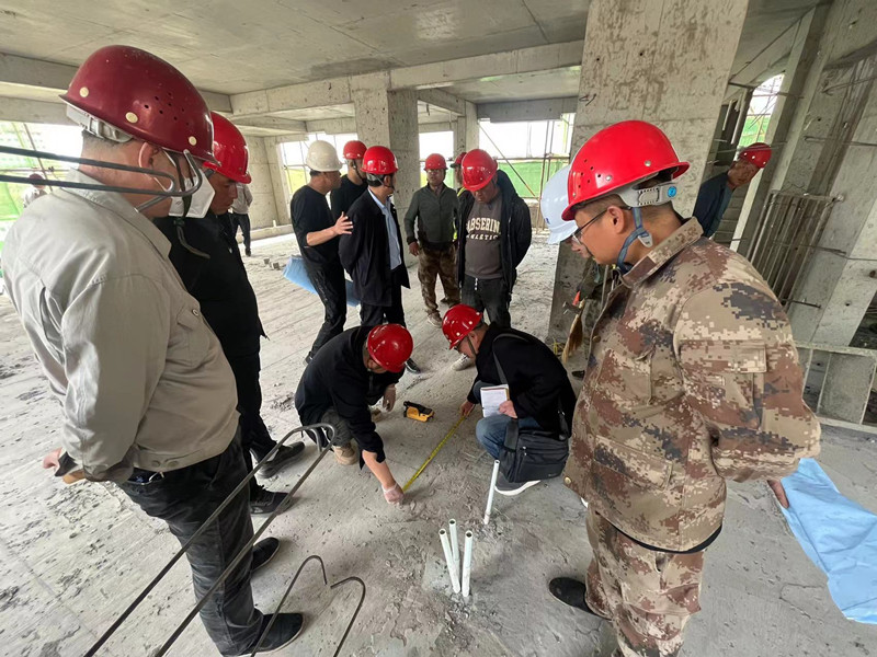 檢查共分為五個小組,分別為質(zhì)量小組對現(xiàn)場混凝土強(qiáng)度、箍筋間距、樓板厚度等進(jìn)行實(shí)體檢驗(yàn);安全文明小組對外防護(hù)腳手架、模板支撐體系、臨邊防護(hù)、防塵措施等進(jìn)行檢查;現(xiàn)場材料小組對材料規(guī)格、合格證、檢測報告、復(fù)試報告等進(jìn)行檢查;特種設(shè)備小組對塔吊的限位器、吊鉤、保險等進(jìn)行檢查及試驗(yàn);內(nèi)業(yè)小組對五方責(zé)任主體的內(nèi)業(yè)資料進(jìn)行檢查。