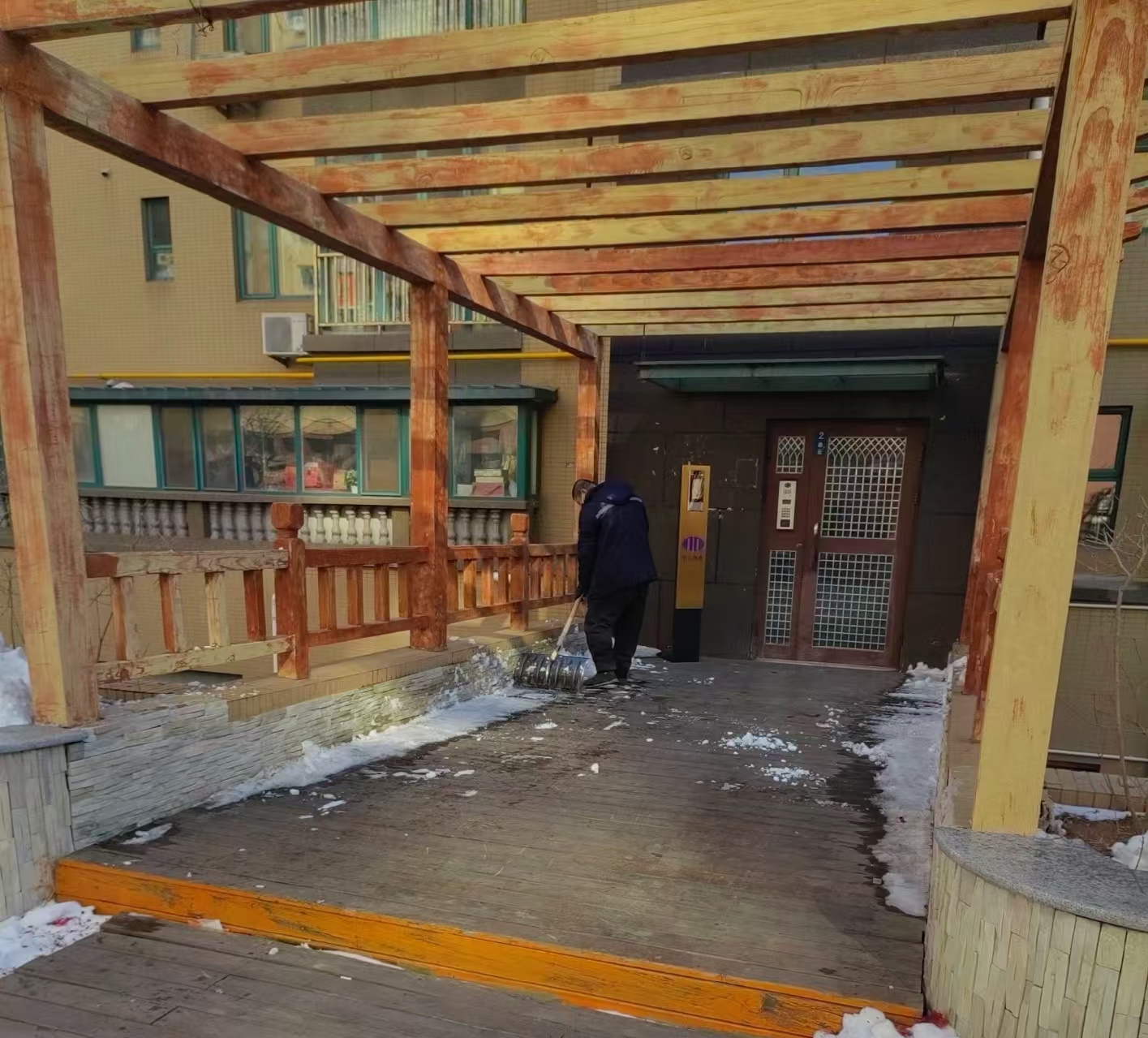 大雪來的匆忙,但是我們物業(yè)人早有準備,在大雪來臨之前就安排好了掃雪工作,按照分配好的區(qū)域有序開展了掃雪工作。物業(yè)除主要崗位留守之外,全員出動,各班組按照“先主路、再支路、后便道”的原則進行有條不紊地清理。由管家、保安、保潔員們劃分各自的區(qū)域,分別清掃平臺積雪,人行路、車路的積雪。由于此次降雪比較急而且大,所以在清掃積雪的同時,也給我們的清掃工作帶來了很大的不便,即使這樣也并沒有影響物業(yè)人清理積雪的熱情,每位物業(yè)人都在對小區(qū)進行認真清掃,積雪清理掉之后,在路面上撒鹽、沙子,確保能夠讓業(yè)主在小區(qū)的各主干路上暢通無阻。雖然天氣很寒冷,但惡略的天氣并沒有影響物業(yè)人員的工作熱情,園區(qū)所有的工作人員熱火朝天,干勁十足的身影到處都是。大家你追我趕,齊心協(xié)力,在早高峰業(yè)主上班前,終于將小區(qū)大門及主要的人行路段的積雪清除完畢,開辟出一條干凈的道路,保證了行人的出行。