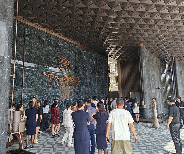 儀式現(xiàn)場(chǎng),熱情高漲的客戶早已匯聚于這座流光溢彩的東大門前。以名貴理石精工筑就、星空頂熠熠生輝、水幕墻靈動(dòng)瀉玉、噴泉水系恭迎貴賓的“星幕尊邸門”,其本身即是歸家尊崇儀式的開(kāi)篇序章,成為令人矚目的視覺(jué)地標(biāo)。人群中,既有開(kāi)盤即購(gòu)房的業(yè)主,滿懷憧憬前來(lái)借鑒設(shè)計(jì)靈感,為未來(lái)愛(ài)家描繪藍(lán)圖;亦有眾多意向濃厚的準(zhǔn)業(yè)主,翹首以盼親身體驗(yàn)升級(jí)品質(zhì),為理想生活尋覓最契合的空間載體。