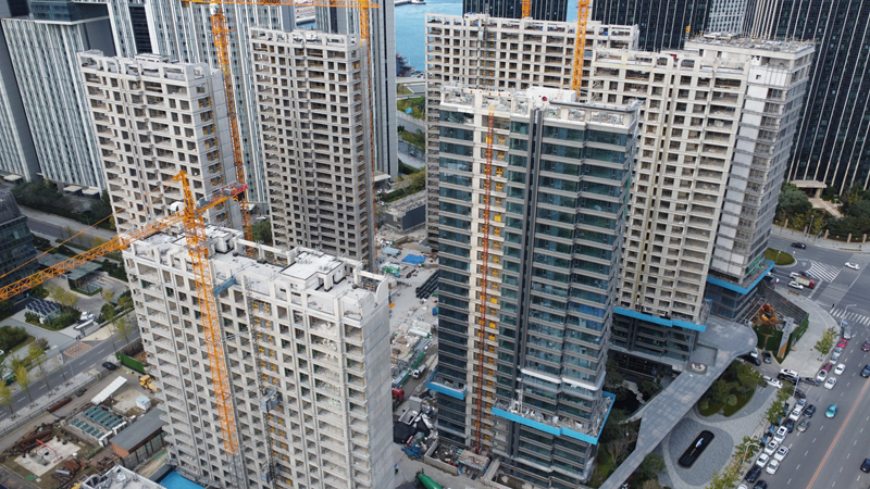 在遼陽城市公司中天·央著項目一期施工現(xiàn)場,主體結(jié)構(gòu)已經(jīng)全部封頂,樣板間已裝修完成并開放,外墻裝飾部分,一半樓棟已基本完成,其余樓棟的外墻保溫、鋁板龍骨施工和涂料施工總體完成50%左右。施工現(xiàn)場防火門、進戶門、窗已陸續(xù)進場,窗玻璃整體已安裝完成50%,地熱及地面施工完成50%,樓梯間瓷磚整體完成30%。電梯安裝單位已進場安裝,施工進度25%。為實現(xiàn)年末完美收官,本月工程部組織各施工單位、監(jiān)理單位、建設單位每周召開例會,安排現(xiàn)場施工進度及需要解決的問題,制定年底施工進度目標,重點關(guān)注施工質(zhì)量,以高要求、高標準的工作作風完美詮釋遼陽首家第四代住宅的品質(zhì),保證達到公司預期的結(jié)果。