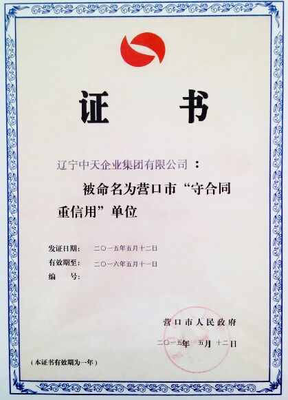 在激烈的市場競爭中,“誠信”是企業(yè)最大的品牌。中天集團(tuán)自成立以來,始終注重加強(qiáng)企業(yè)的誠信建設(shè),堅(jiān)持誠信為本、信用至上的發(fā)展原則,用誠信打動客戶、用誠信贏得市場,打造“誠信中天”的企業(yè)品牌。2015年,集團(tuán)再次被評為市“守合同重信用”單位,這是中天集團(tuán)多年來一直堅(jiān)持守合同重信用工作,以誠信推動企業(yè)發(fā)展的結(jié)果;是對中天集團(tuán)全體員工日常點(diǎn)點(diǎn)滴滴辛勤工作的溫情回報;更是社會各界對中天集團(tuán)持續(xù)、穩(wěn)健發(fā)展的充分認(rèn)可與贊揚(yáng)。
