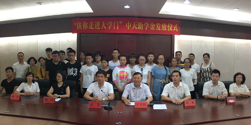 2017年8月11日上午,營口市希望工程扶你走進(jìn)大學(xué)門之“中天助學(xué)金”發(fā)放儀式在中天集團(tuán)總部會議室舉行。中天集團(tuán)董事長于寶權(quán)、共青團(tuán)營口市委書記遲程、營口市希望工程辦公室主任趙潔等領(lǐng)導(dǎo)出席了本次發(fā)放儀式。來自省實驗營口分校、營口市第三高級中學(xué)、大石橋市高級中學(xué)、大石橋市第二高級中學(xué)以及蓋州市第一高級中學(xué)的16名貧困學(xué)生每人從于寶權(quán)董事長手中領(lǐng)到5000元捐助資金,解決了他們的入學(xué)費用,圓了他們的大學(xué)夢。